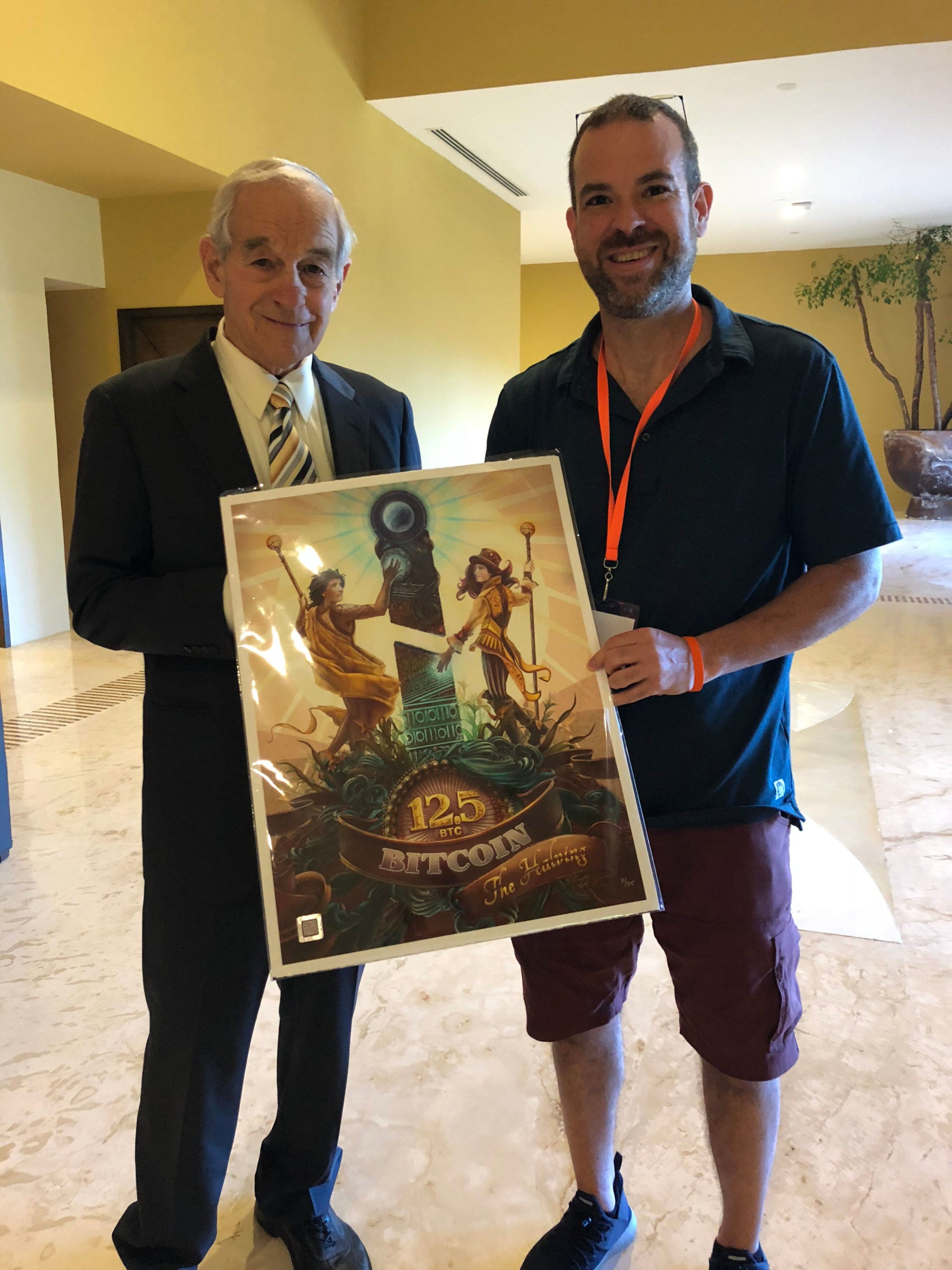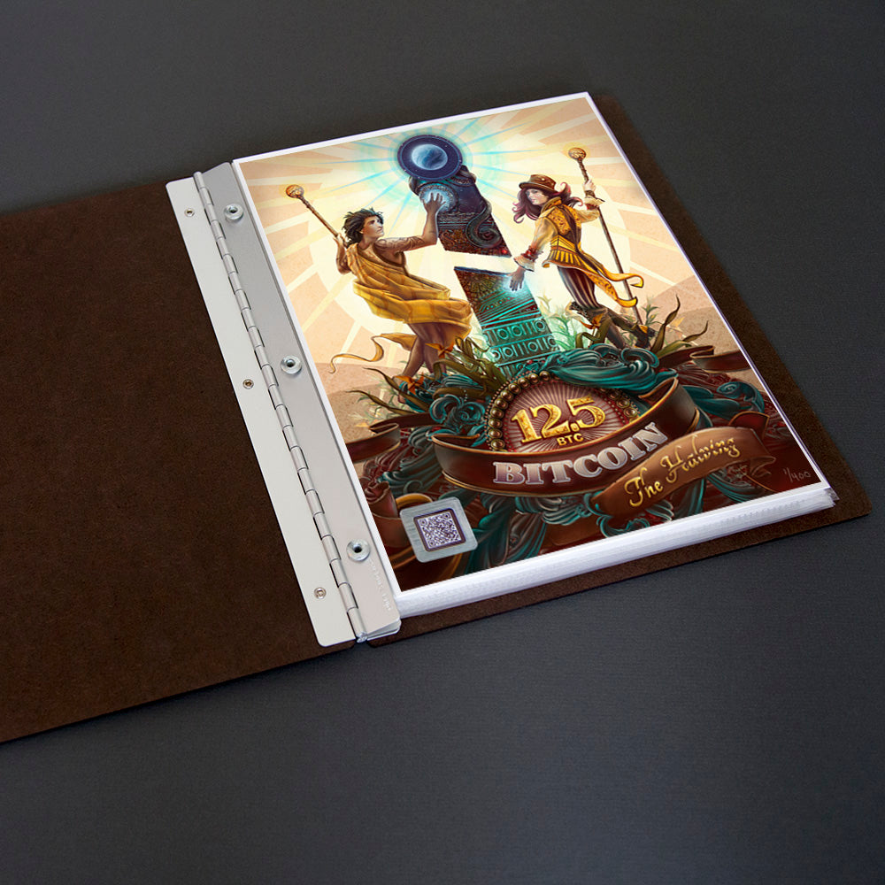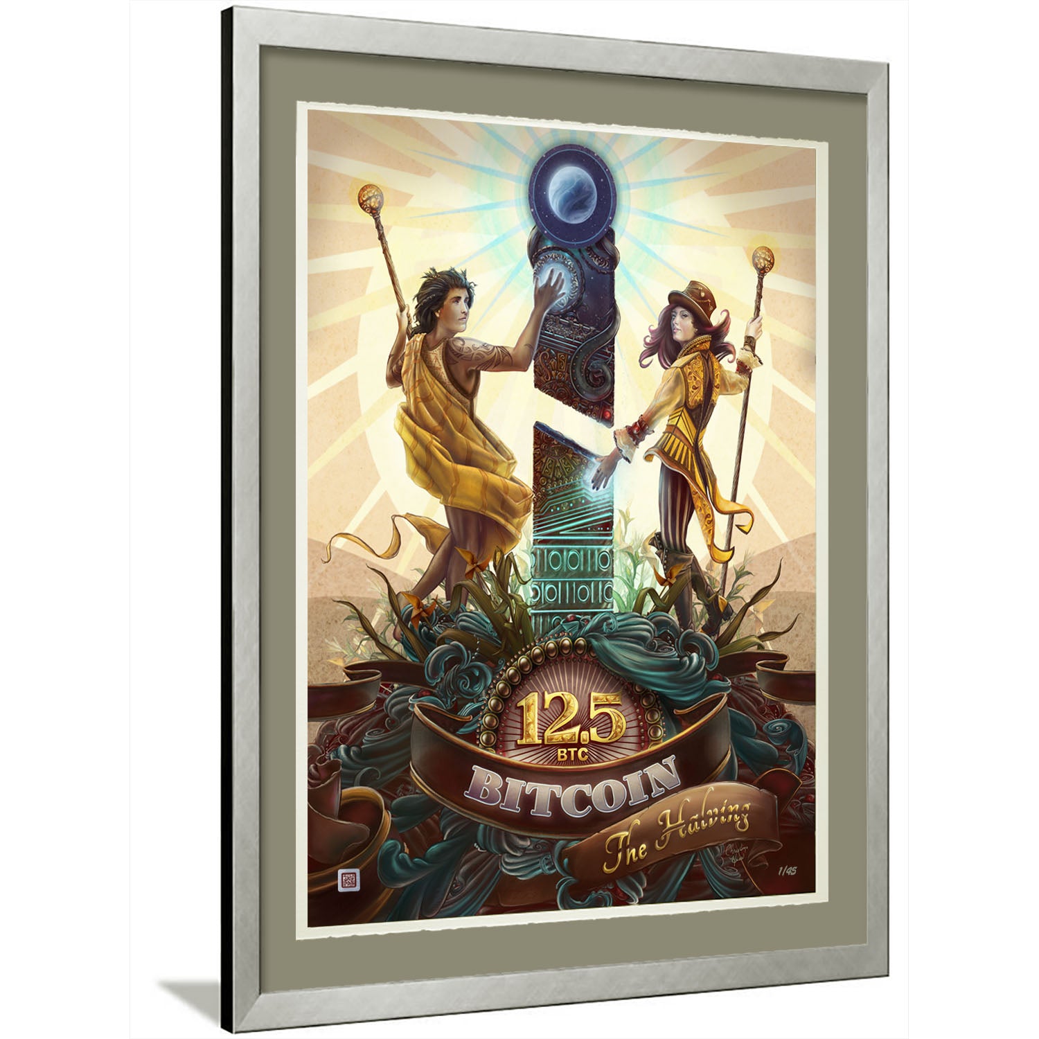 “The Halving” was created by artist Christina Hess in celebration of the 2016 Bitcoin Halving. “The Halvening” is an event that occurs approximately every four years and signifies a reduction in the rate in which new bitcoin is released. In July of 2016, the amount of bitcoin released in each new block dropped from 25 to 12.5. Since new blocks are generated on average every ten minutes, this represented a significant reduction in the dilutive effect of new bitcoin. 75% of all bitcoin that will ever be created was released by this point.