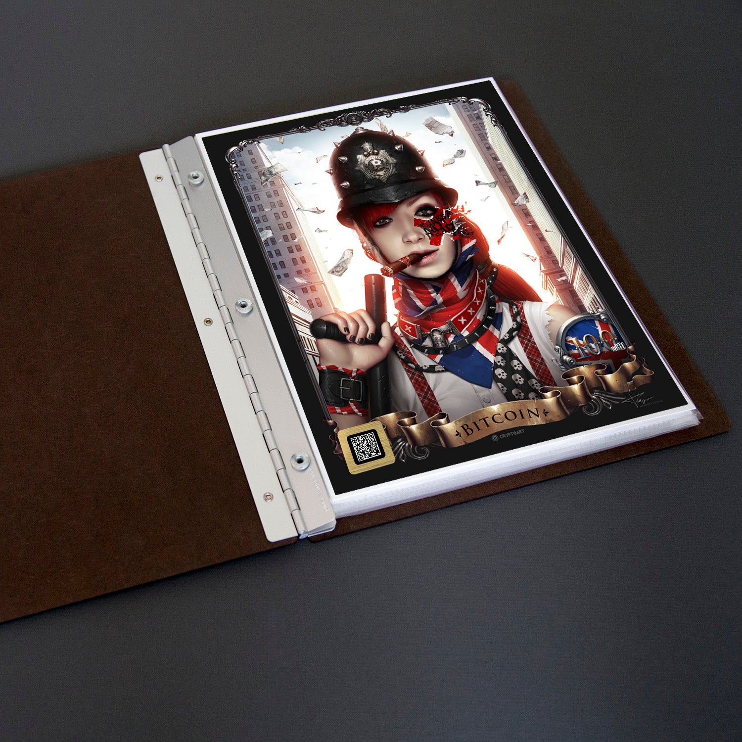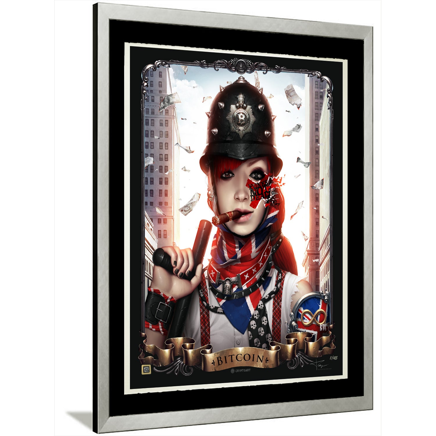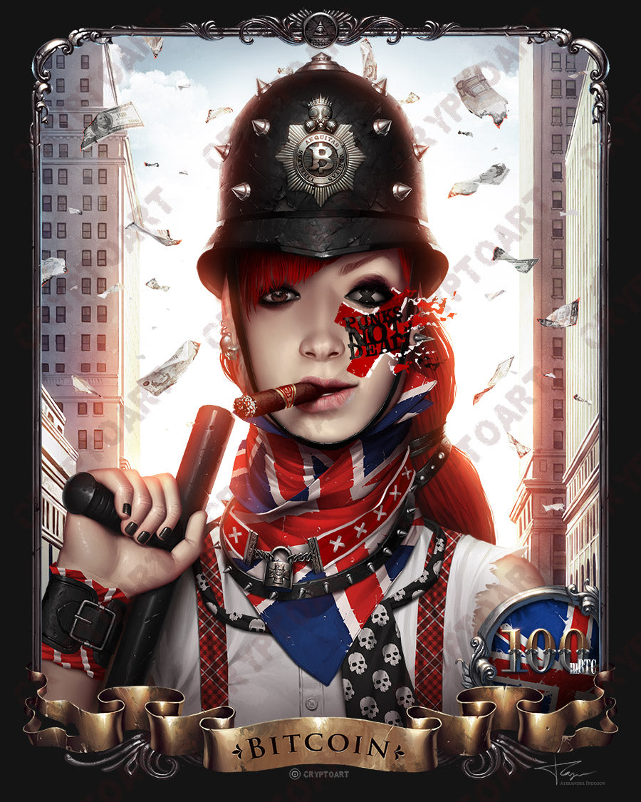 Bobby was created by artist Alexander Fedosov, a Ukrainian illustrator who excelled in hyper-detailed, dark fantasy art. It’s part of a series of five works portraying Bitcoin as the weapon, usable by anyone to escape the fiat system. Alexander was one of the first artists to contribute to the cryptocurrency movement and created the cover for Bitcoin Magazine, issue #21.