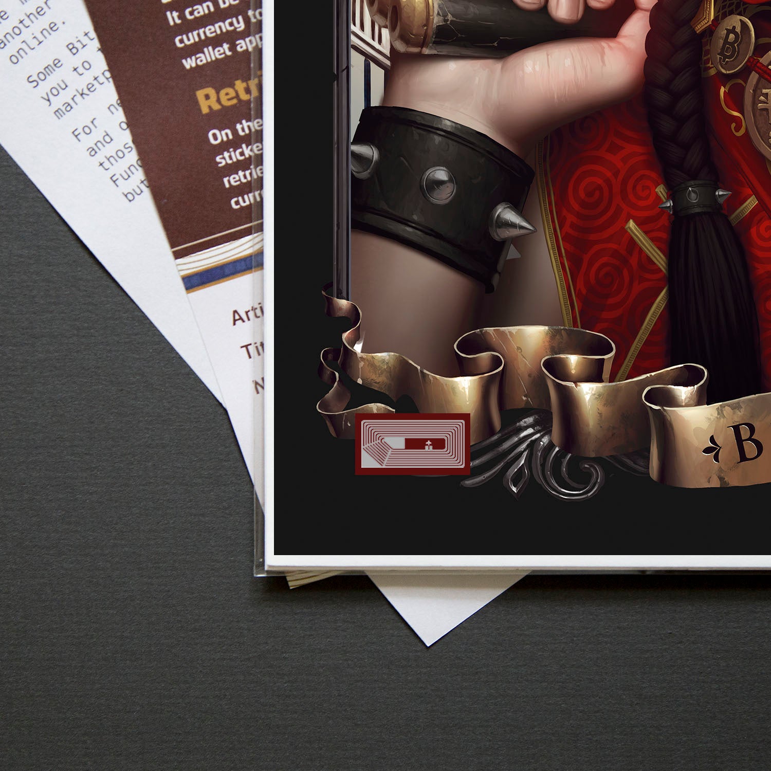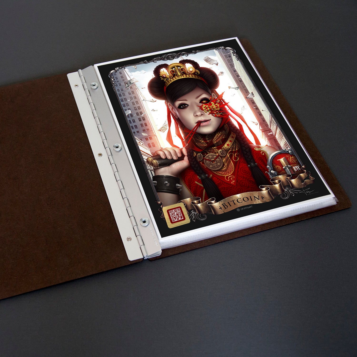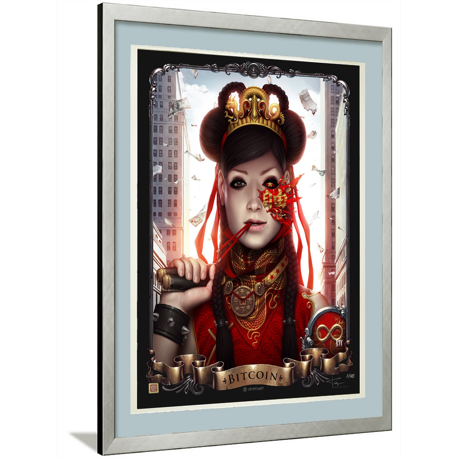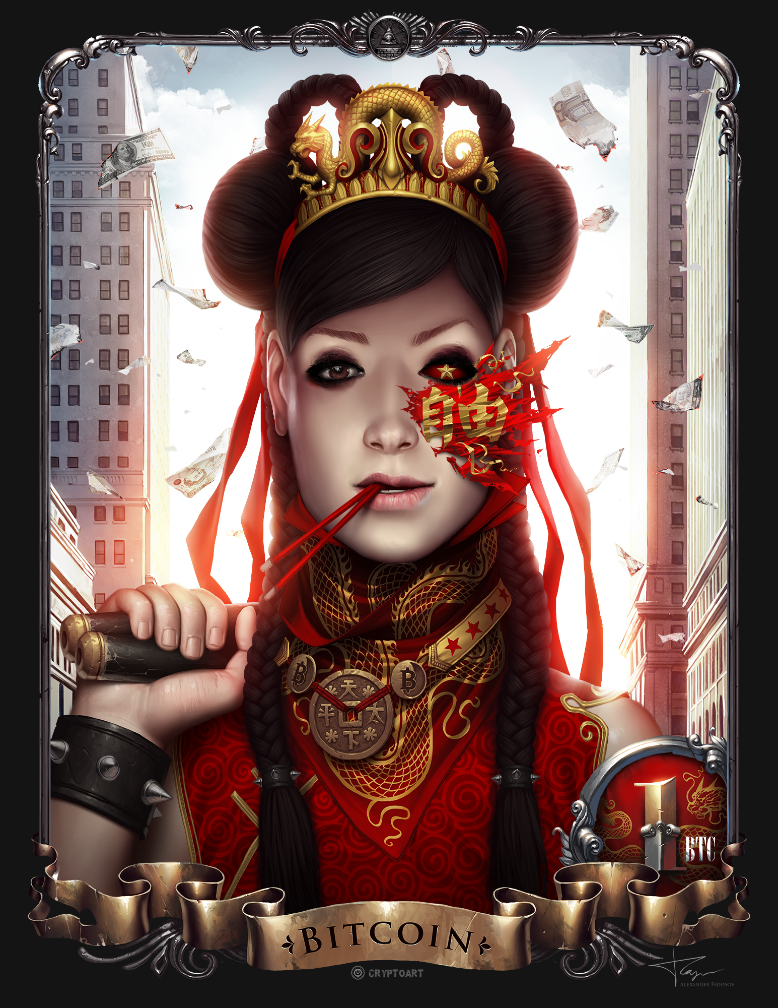 Chinese Girl was created by artist Alexander Fedosov, a Ukrainian illustrator who excelled in hyper-detailed, dark fantasy art. It’s part of a series of five works portraying Bitcoin as the weapon, usable by anyone to escape the fiat system. Alexander was one of the first artists to contribute to the cryptocurrency movement and created the cover for Bitcoin Magazine, issue #21.