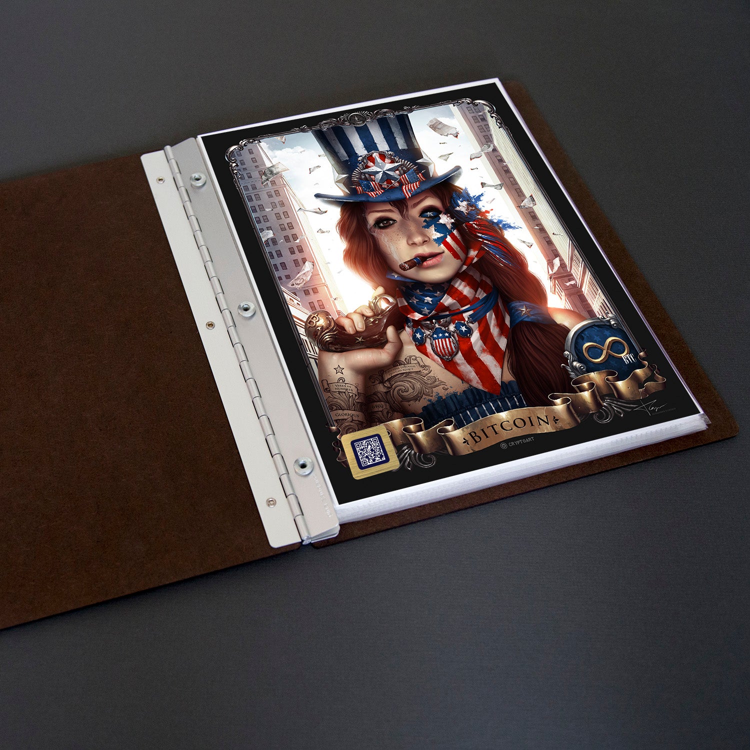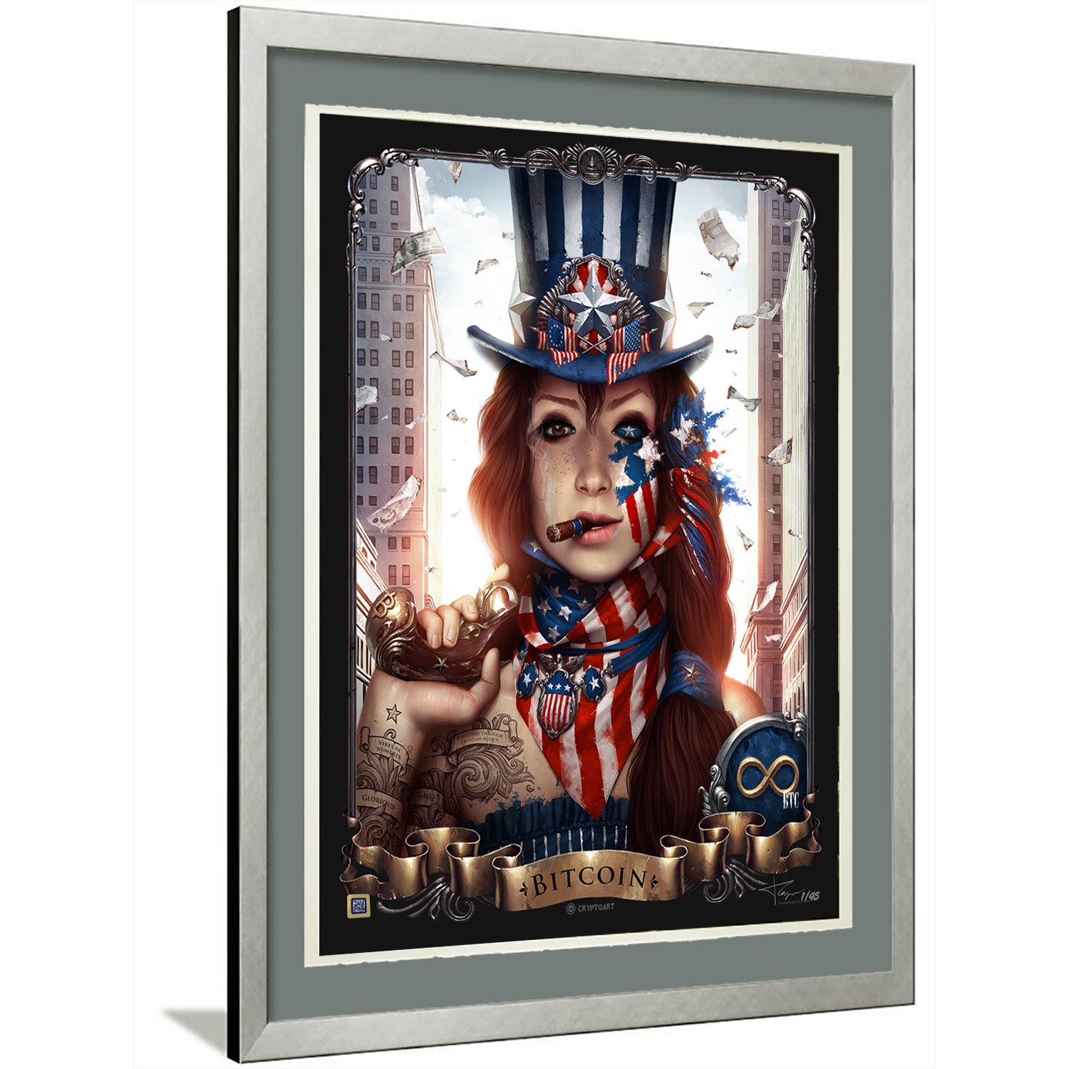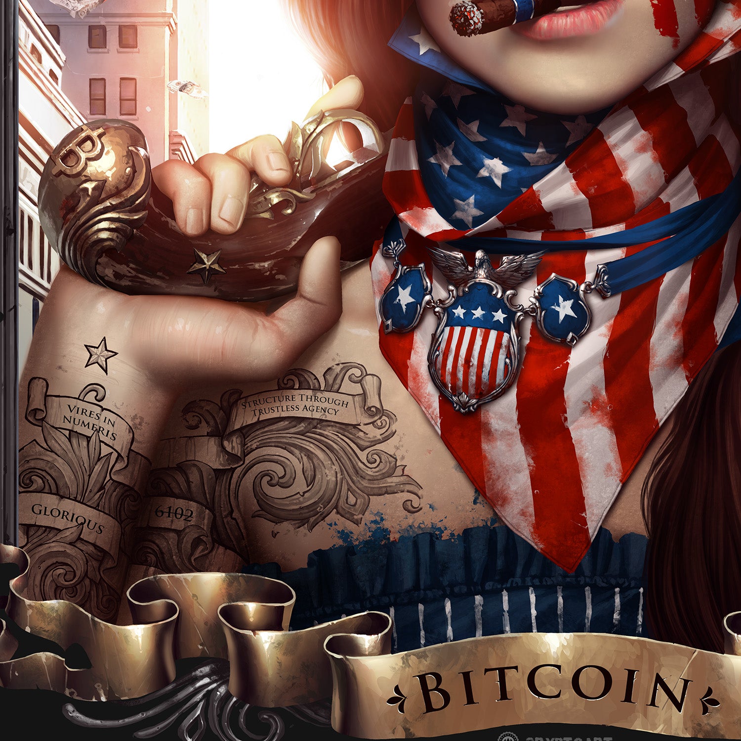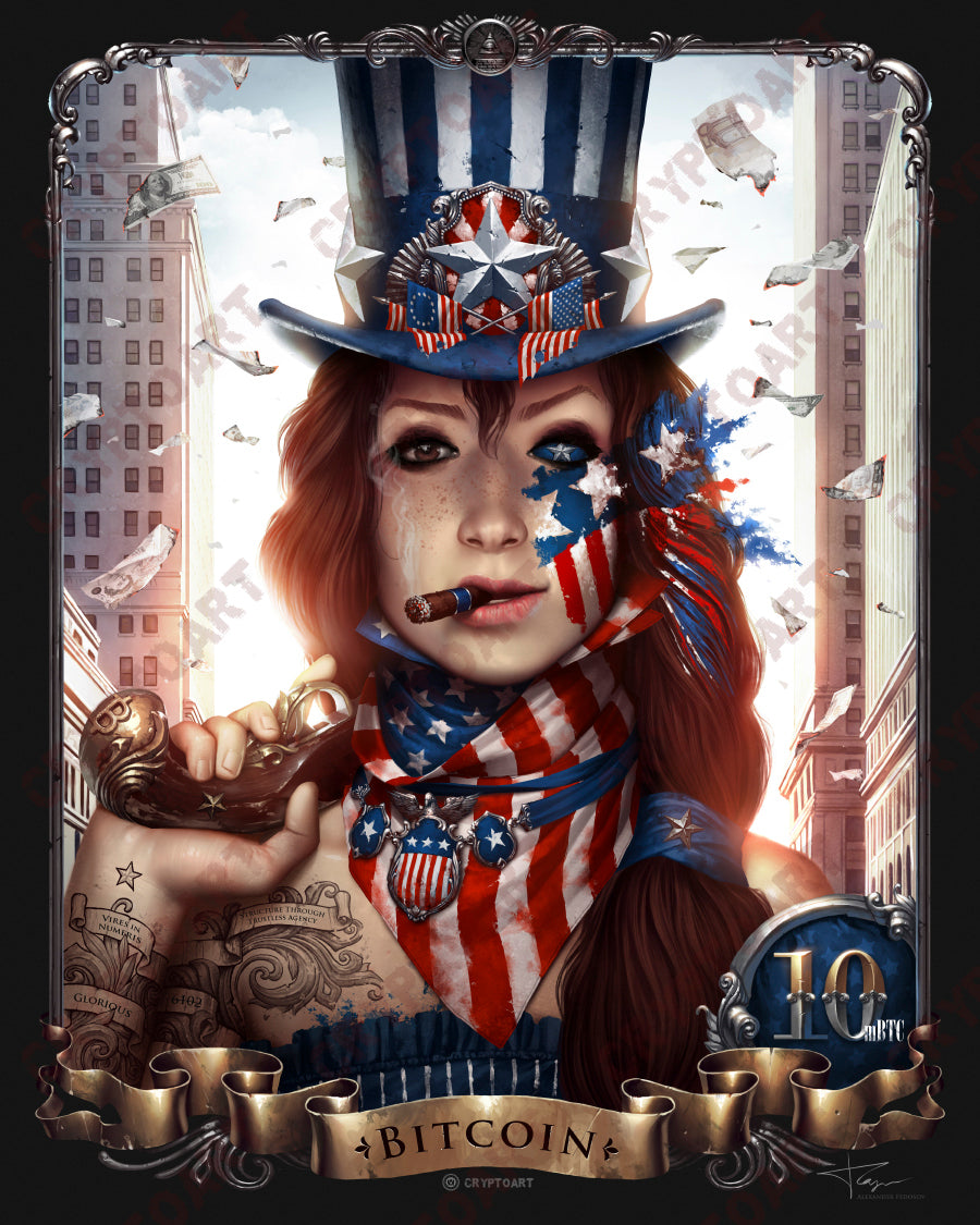 This is the first art piece published by Cryptoart, and it's believed to be the first fine art collectible to utilize blockchain technologies. The Patriot was created by artist Alexander Fedosov, a Ukrainian illustrator who excelled in hyper-detailed, dark fantasy art. He was one of the first artists to contribute to the cryptocurrency movement and created the cover for Bitcoin Magazine, issue #21.